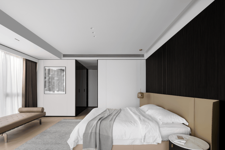 私密场域依旧保持静谧,黑白色基础上搭配了更多的色彩,例如深棕、浅紫等,艺术品的衬托深邃迷人,热络了家的氛围。