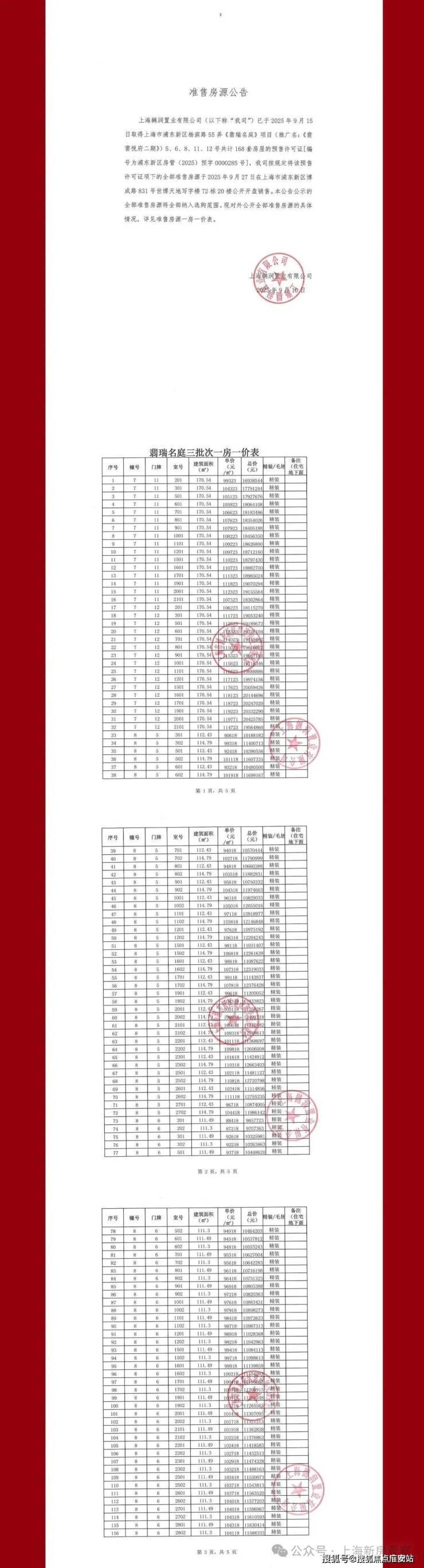 上期一房一价表如下: