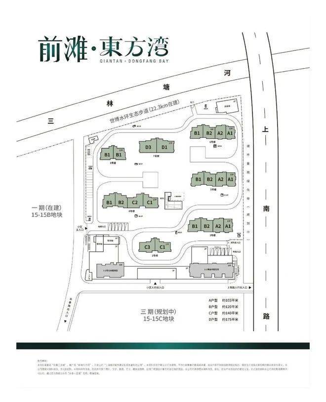 前滩·东方湾位于上海市浦东新区永泰路353弄,是浦东三林板块的高端住宅项目,主打建面约103-175㎡的3-4房户型,单价约7.8万/㎡起。