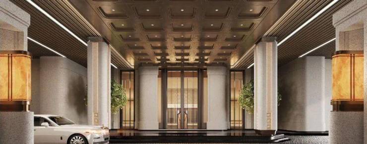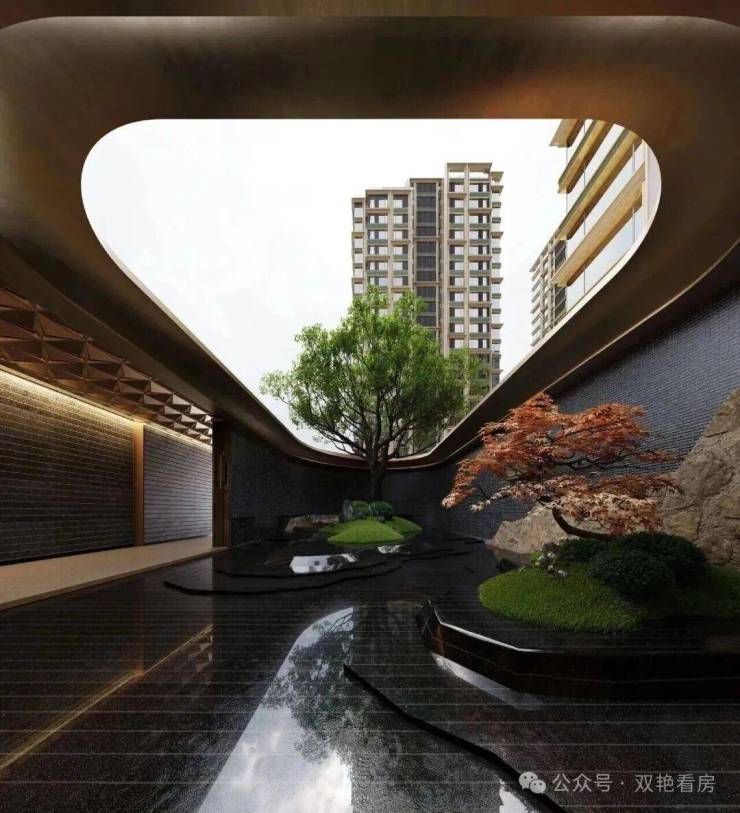 山水长卷的隐奢门庭:取意豫园中式园韵,打造约 99 米隐奢入口空间结合独立的车马院,风雨廊道与人车分流独立双入口,带来尊贵的归家体验。