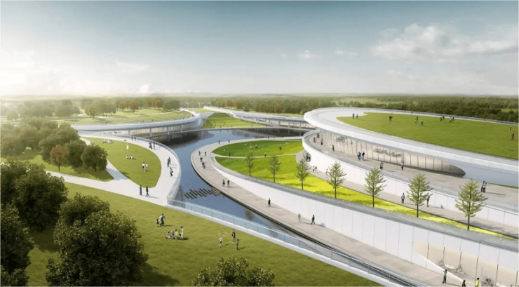 南部二期工程则以“动”为主,侧重打造一个掩映在绿色生态之下的城市体育文化休闲空间。地上景观和地下空间的自然融合是这块绿地的最大亮点。