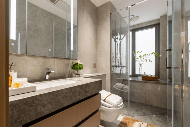 细节相当多,再提一点,卫生间台面都选用天然石材,触感光滑、厚重。