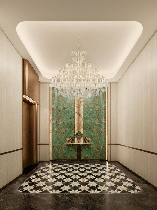 每一户还标配原厂装修的日立电梯。就连车库电梯厅也进行了豪华精装,精致的大理石拼花地面,整面墙的奢石铺装,金属质感的电梯门,每一户都拥有奢华独立的归家空间。