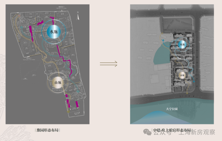 社区内部,设计团队以豫园为灵感蓝本,运用现代手法重新诠释豫园的“山脉”与“水脉”,打造出一座立体起伏的山水园林。