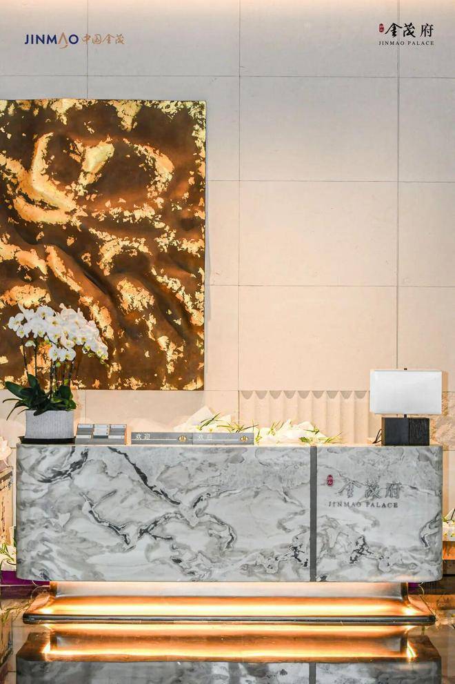 门头的接待台,选用意大利芬迪白奢石,挂画灵感取自汉字“兰”的形意,尽显尊贵的同时也呼应金茂府业主精致圈层。