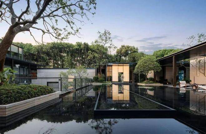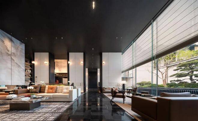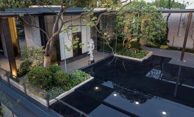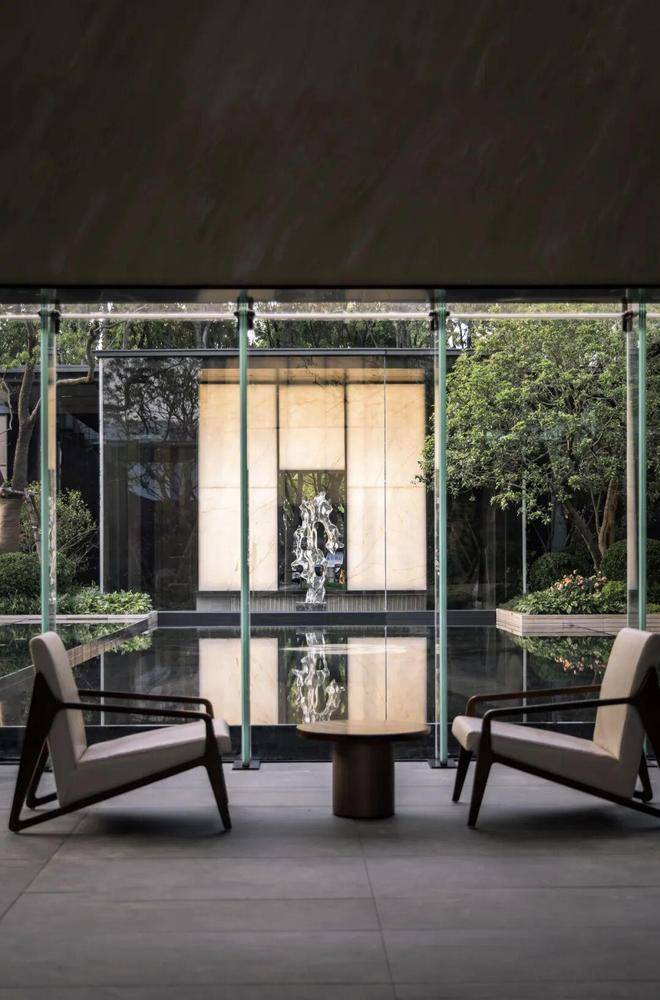 漫步于这样精致、这样不计成本用材、处处皆景的美学庭院中,我们看到一幅“浮光潭影”般的场景,整个社区中大量采用的透光玉石、珍贵奢石、金属廊架、以及苹果店同款工艺的超大落地玻璃窗,在绿植和水景映衬共同构成一幅美学生活画卷。