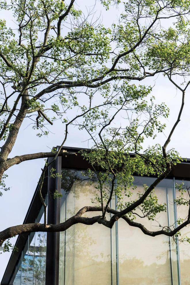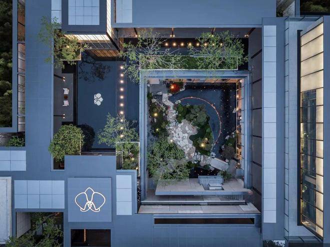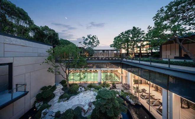金茂府3.0标志性的下沉式庭院景观打造一个缩小版的苏州园林,采用以小见大的设计手法打造院中天地。其中的迎客松是从山东莱芜山区用直升机空运出来,再全冠移植运送到苏州,只为呈现山水真趣,处处皆景,不管白天还是晚上都非常惊艳。