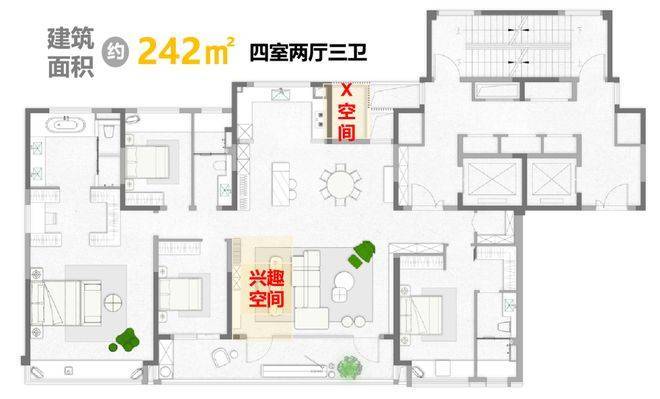 这款狮山金茂府的起步户型,4房2厅2卫的设计,约15米南向面宽、4开间朝南、双联阳台还是270°转角阳台、LDKB一体化设计,全屋5个飘窗。