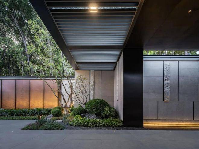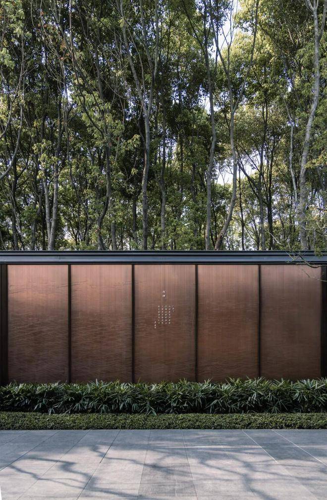 实景呈现的北府门仿佛被隐藏在城市森林中,拥有自然密林的感受,超万方香樟森林带来隐奢贵气,两侧12面奢石屏风,以及1008片水波纹铜瓦构成的艺术墙体,寓意着业主事业步步高升,将归家的体验感拉满。