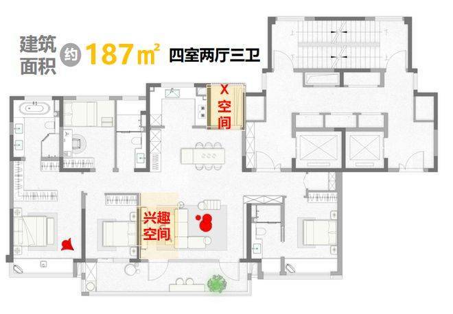 建面约187㎡四房三卫,也做到了约17.8米的惊人面宽。四开间朝南,大横厅设计加上双联大阳台+270°转角,景观视野一流。这款户型同样设计了两个南向套房,3个卫生间均为明卫。主卫采用双台盆+浴缸+淋浴的布局,尊崇私属感更强。