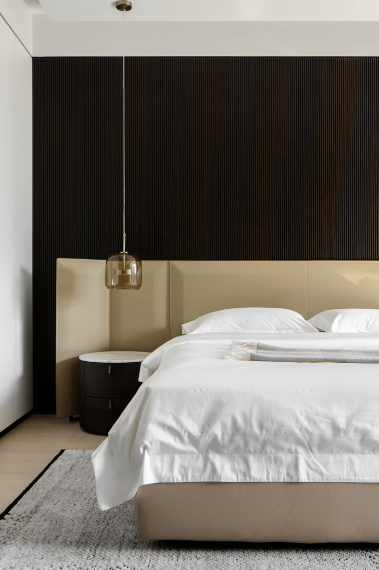 私密场域依旧保持静谧,黑白色基础上搭配了更多的色彩,例如深棕、浅紫等,艺术品的衬托深邃迷人,热络了家的氛围。