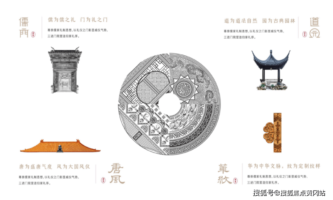 用现代材料和工艺,传承中国传统建筑文化精髓,凝练出独属于自己的“儒门、道园、唐风、华纹”匠造理念。