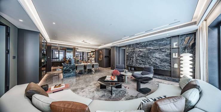 整个公区的引入沉香米黄、透光云石、安哥拉黑、福鼎黑、橙皮红、宝格丽紫等近二十种全球奢石,宛如一座流动的奢石博物馆。