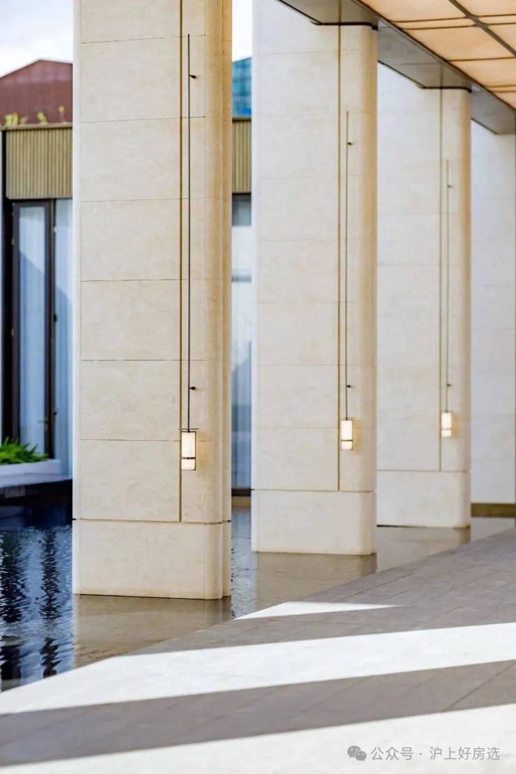 顶部定制发光云石亚克力与圆弧形的古铜色铝板交相辉映,8个西班牙宫殿沉香米黄石柱提升了尊崇感,漫步其间,揽风入怀,树影斑驳映入眼帘,水声潺潺入耳,归家的轻松感油然而生,笔者随手一拍,都非常的出圈。