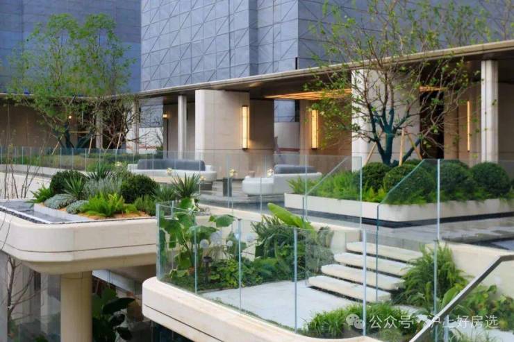点睛之笔在于4层悬浮式阶梯,设计理念据说来自全球十二大奢华酒店之一的迪拜丽晶公寓,每一个观景露台都种植着不同的植被,一步一景,更重要的是,不同的露台对应着不同的观景视野点,将不同高度的下沉式庭院景观,通过极其优雅的方式传递给了业主。这个归家体验可以说是拉满了!