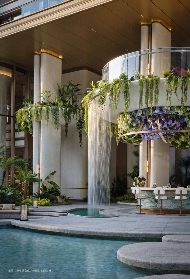 会所,藏着两种人生。环绕水院而生的,是约3000㎡的双会所体系。下沉会所里,恒温泳池的星空马赛克璀璨如银河,私宴厅的顾绣墙面低语着松江的文脉;架空层的泛会所中,挑高约9米的双层书吧用整面巨幕玻璃把水院框进窗里,阳光穿过瀑布洒落书页。而那座约12米高的艺术水幕旋梯,十片“飞羽”造型盘旋而上,拾阶之间,每一步都与光影相遇。