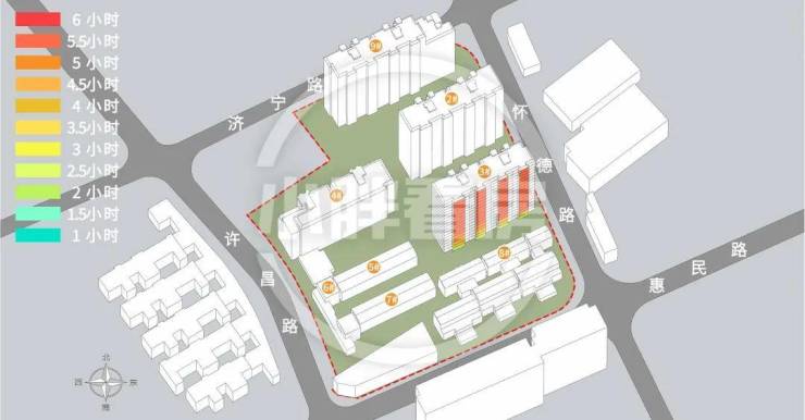 这是冬至日(9-15时)3号楼的日照采光,可以看到,除了一楼二楼,几乎是完全拉满的状态。