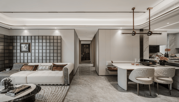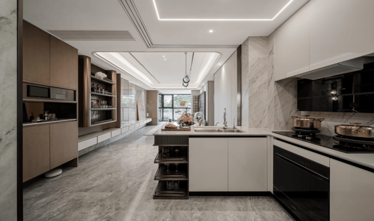 ·餐客厅踢脚线和厨房门框均为金属材质,开关面板全部定制同色系,把房屋美学做到极致……