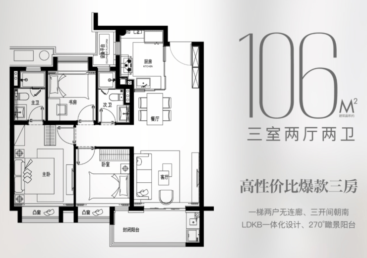 客餐厅一体化+开放式厨房+大尺度观景阳台,整个公区几乎没有面积浪费,营造的空间感和尺度感远超同价位其他竞品;