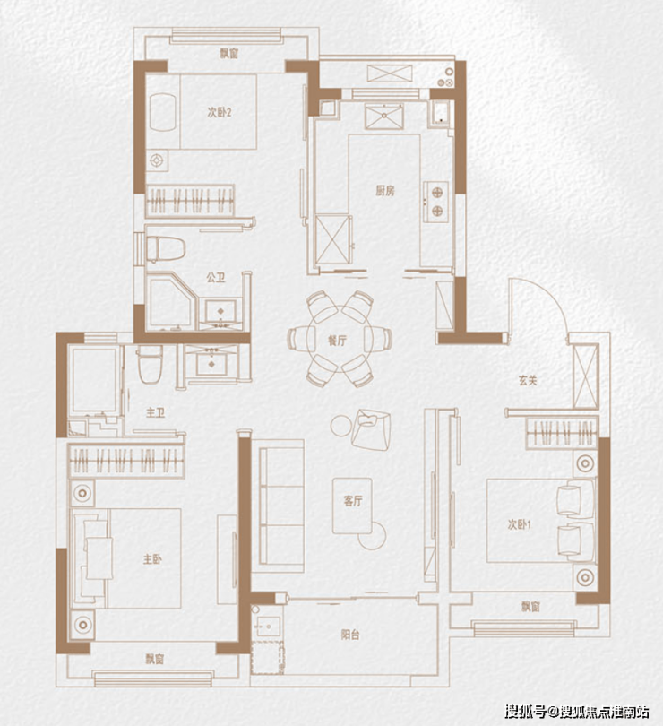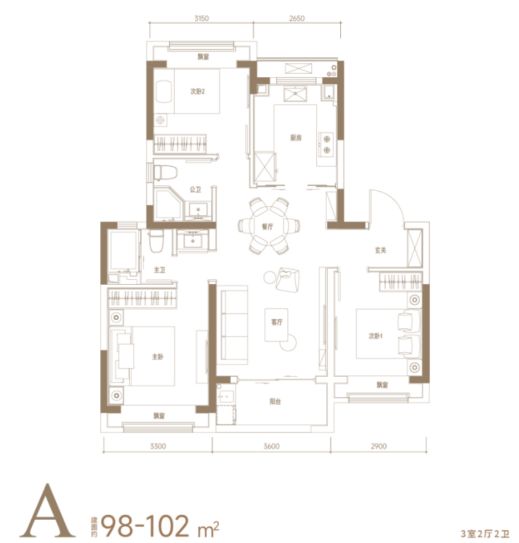建面约98-102㎡3房2卫为三开间朝南板式户型,南北通透。