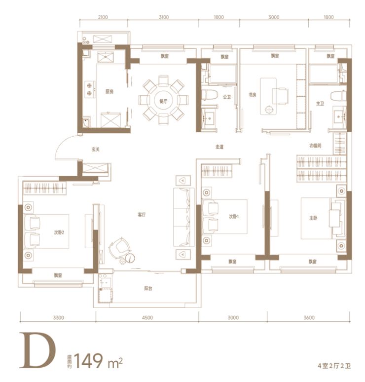 项目主力户型为建面约98-102㎡3房2卫,此外还有123㎡4房2卫、136㎡4房2卫、149㎡4房2卫,166㎡4房3卫。