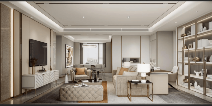 甚至连媲美豪宅的客厅、主卧悬浮吊顶、无主灯设计,皮革和铝合金拼接背景墙,以及极窄边铝合金的踢脚线都为购房者定制好了。