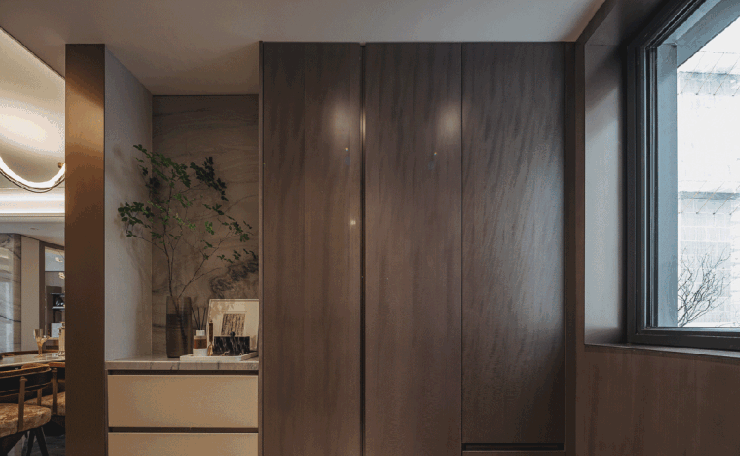 地下归家大堂用材选取意大利进口岩板,色泽温润,和谐统一。人脸识别自动移门便捷实用,金属夹丝玻璃美观大气,开阖家的尊崇与安心。