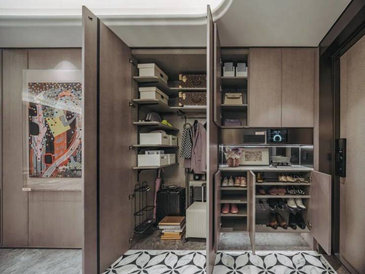 进门玄关柜采用双面科技木皮包裹,玄关地面的海派拼花。