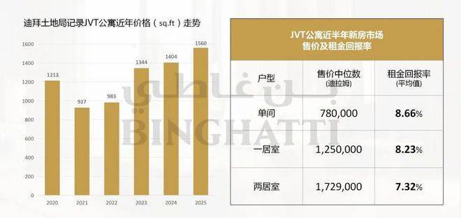 JVT公寓近年价格2021年为近年价格低点,随后稳步上涨,至2025年已达 1,560 AED/sq.ft,较2021年低点涨幅约 68%。当前JVT区域租金回报率平均在7.3%-8.7%之间,具备良好投资回报值。