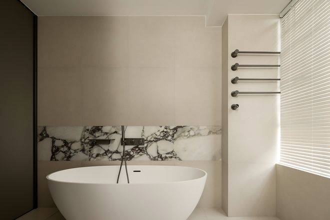 99㎡三房两卫,99㎡整体“大面宽、短进深”,南向开间将近11.7米。约5.5米的大横厅,连上外接的南向大阳台,形成了一个尺度感超强的公区。主卧除了自带的飘窗和独卫,甚至还预留了一个走入式衣帽间的空间。