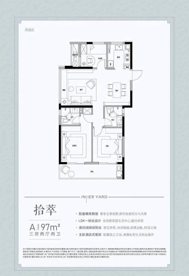 建面约97㎡三室两厅两卫户型都是边套,三面采光,还有很难得的6.4米南向双阳台,3.9米的景观大飘窗,类似的尺度市面上基本要120㎡的户型才能做到。