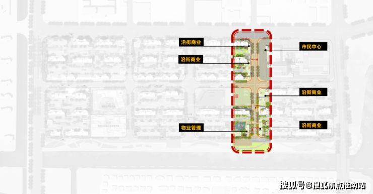 一街为活力商业街,通过纵向布局,在街道两侧配上丰富立体的商业,包括沿街商业、邻里中心、乐活商业街等,满足居民日常的需求。