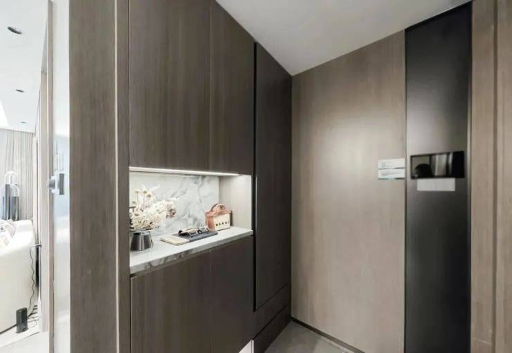 在细节上同样不遗余力。比如入户后的玄关柜是交付标准,打开厨房柜体、镜柜等各类收纳空间时均有惊喜;再如客厅和主卧均采用弧形吊顶,还有风暖浴霸、玄关顶面感应灯等细节,都透露出项目对品质生活的追求。