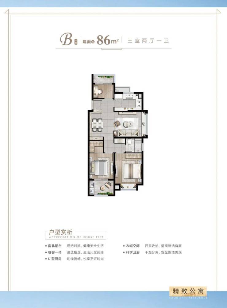 建面约86㎡3房2厅1卫,做到了双开间朝南+双阳台设计+卫生间干湿分离,一个非常紧凑的小3房户型。