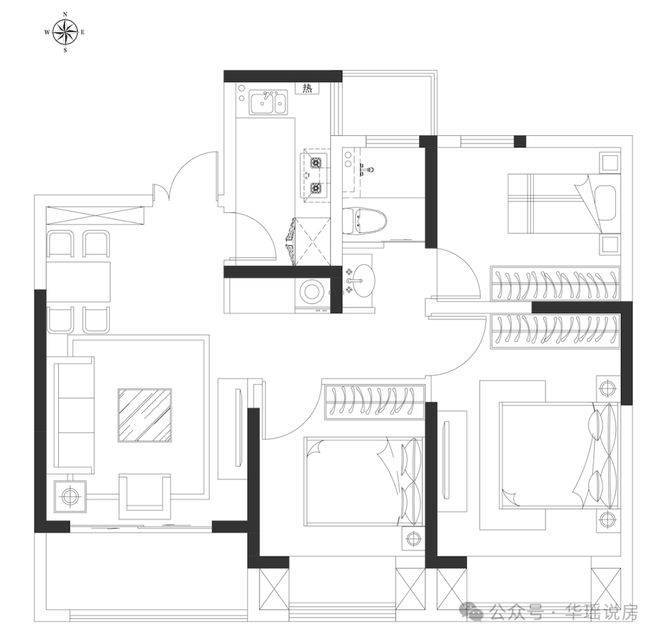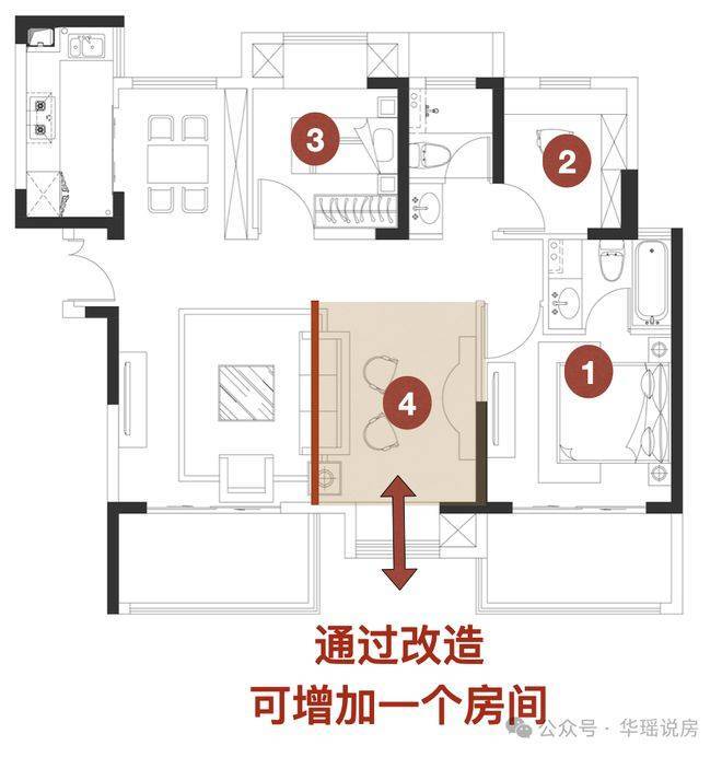如果你觉得3个房间太少,还可以在客厅中加一道墙,做成4房户型,这样无论是二孩家庭,还是夫妻+宝宝+父母同住,都能住下。这功能性,拉满了!
