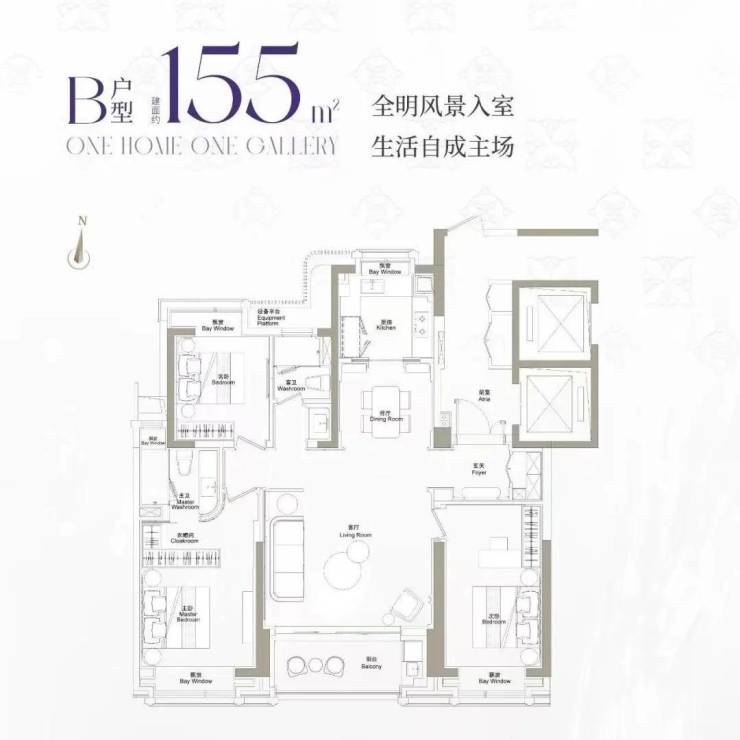 近全飘窗设计,扩展了生活的尺度感;主卧豪华套房设计,兼顾私密性与居住舒适度!