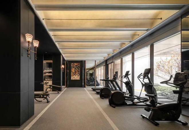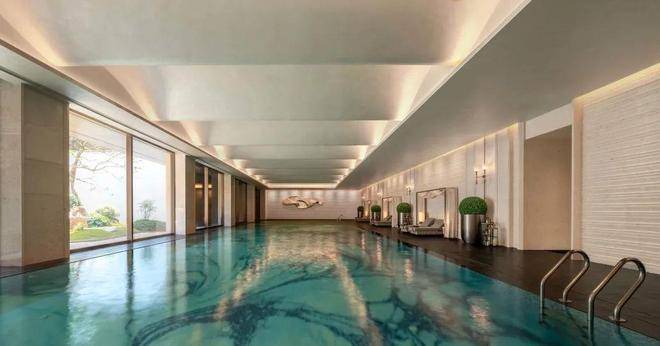 会所泳池天花吊顶以流动的曲线模拟潮涌,底部以8种渐变色彩、3000余片马赛克拼贴打磨出整幅图案,水光波动间花纹呈现出流动的韵律感;健身房内除配备全套进口品牌必确健身器材外,可享受窗外园林美景和力量区配置运动防滑毯带来的安全感……