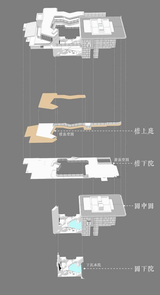 如玺华院一口气做了四个意境不同的庭院空间,彼此嵌套,构成了一个T字形的高浓度园林系统。整个会所突破性地做了三层观景式设计,形成下沉式庭院+檐下游廊+亭台楼阁的立体格局,整体高差达15米,置身其中,蔚为壮观。