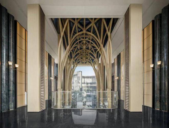 除了地面归家大堂之外,越秀还特别考量现代车行归家的生活习惯,匠心独运地增设了宽敞高挑的穹顶车马厅,打造双向动线礼序空间;尽管位于地下,此处却巧妙引入自然元素,光影交织,每一角落都洋溢着东方园林的现代韵味。