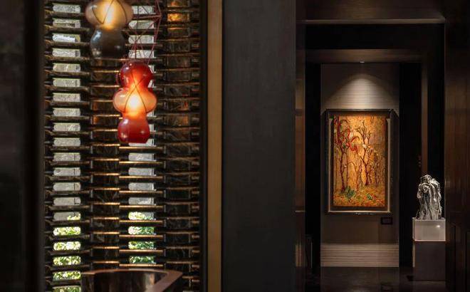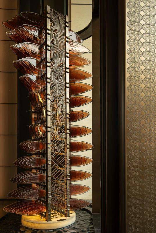 除此之外,空间在在地文化细节方面的导入更是俯拾皆是:首层接待厅的金属骨架吊顶复刻乔司海塘垒石肌理,与杭州丝织纹路交织;负一层沙盘区的雕塑融合丝绸与盐晶元素,凝固钱江潮韵律;私宴区的吊灯外罩杭州丝绣,搭配古代盐课司晒盐场景地毯,让宴饮成为文化叙事现场……
