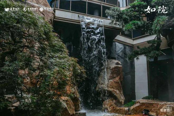景观中庭的设计是市面上极为少见的三层观景式设计,以北宋画家范宽的《溪山行旅图》为范本,叠石、壑松及高低落差约15米飞瀑,亭台楼阁、檐下的游廊、小桥流水相互映衬,宛如一幅山水画卷。