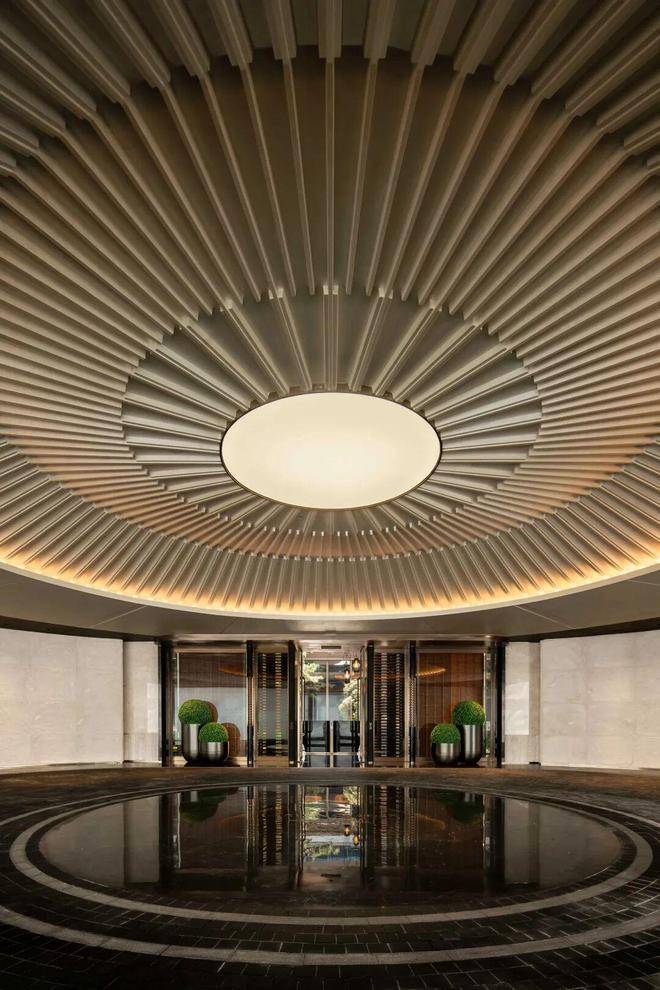 基于杭州曾经作为南宋古都的气候环境与文化底蕴,如玺华院选用相较石材颜色更加丰富、轻巧,且可防尘、防潮、降噪、自洁的环保天青陶板,经过20多道工序烧制、仅30%成品率的投入和挑战,将南宋官窑汝窑“雨过天青云破处”的温润质感复刻于外立面,打造出“会呼吸的墙体”;搭配紫点金麻石材与如意云纹镂空格栅铝板,更添尊贵雅致。