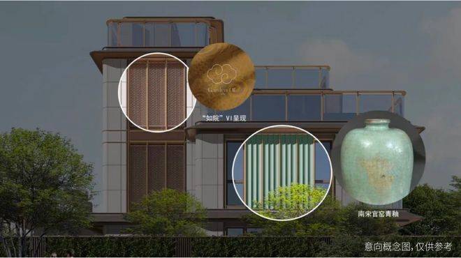 如玺华院建筑立面提取浙江亭巧妙地将避风䈋转化为精致的镂空山墙,雕刻以“如意祥云纹”,融合了古典美学与现代工艺。檐杆与良渚玉琮的元素提炼,融入建筑肌理之中,简约的重檐翘角勾勒出《诗经》所载的东方韵味。漫步其中,仿若穿越时空,每一笔线条都是对南宋风华的现代诠释。