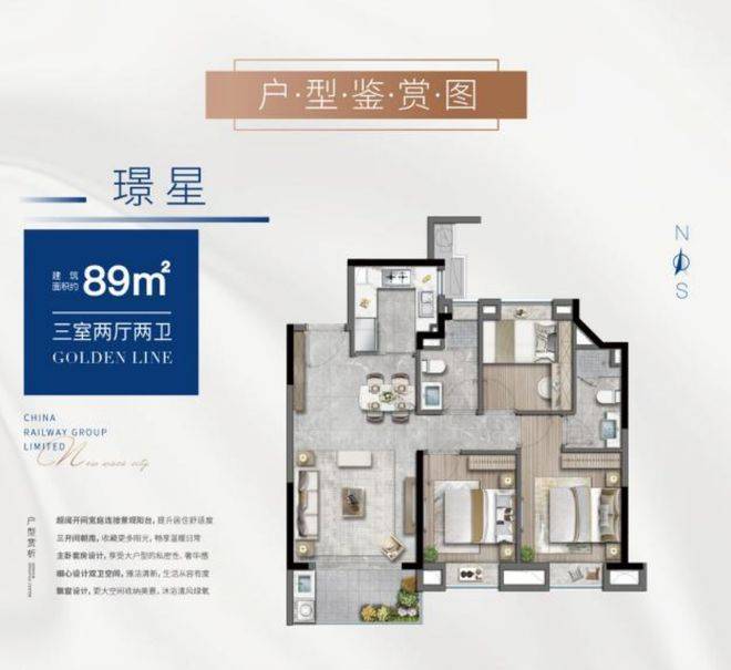 约89㎡的建面即能实现3房功能性还有2卫,主卧实现套房配置,放眼全市性价比都分外突出!格局上做到了三开间朝南,采光效果佳,客餐厨一体化减少动线,对室内面积极致利用!