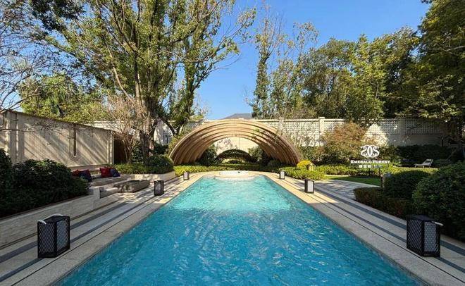 庭院配置:每户标配南北双花园,多数含几何形蓝宝石私家泳池,部分临湖户型视野更佳;花园最大约 289㎡,法式对称布局,廊架、水景、草坪层次分明。