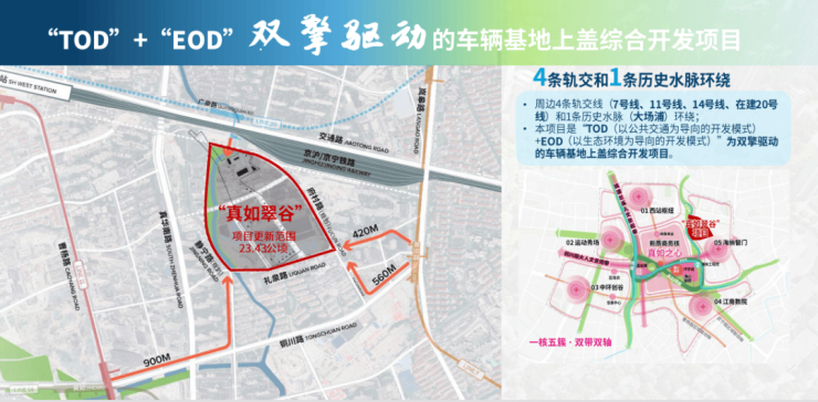 项目地处真如副中心东部,更新范围约23.43公顷。项目以“TOD(以公共交通为导向的开发模式)+EOD(以生态环境为导向的开发模式)”为双擎驱动的车辆基地上盖综合开发项目,紧邻东侧轨交7号线岚皋路站和北侧轨交20号线广泉路站(在建)。