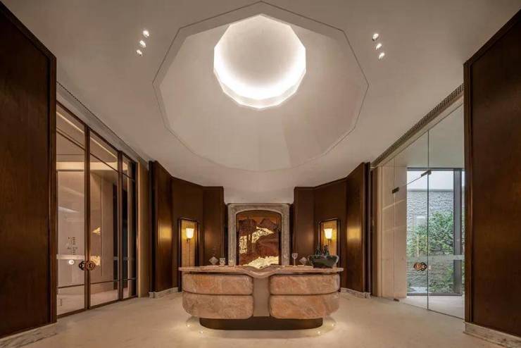 水院内还有一座堪称“视觉奇迹”的浮岛殿堂,由非遗陶板与超白玻嵌构而成。当你在其中小憩或会客时,无论是天光折射入水院,抑或水纹辉映其上,都如同建筑之上的流动音符,在进行一场精神对话的邀约。