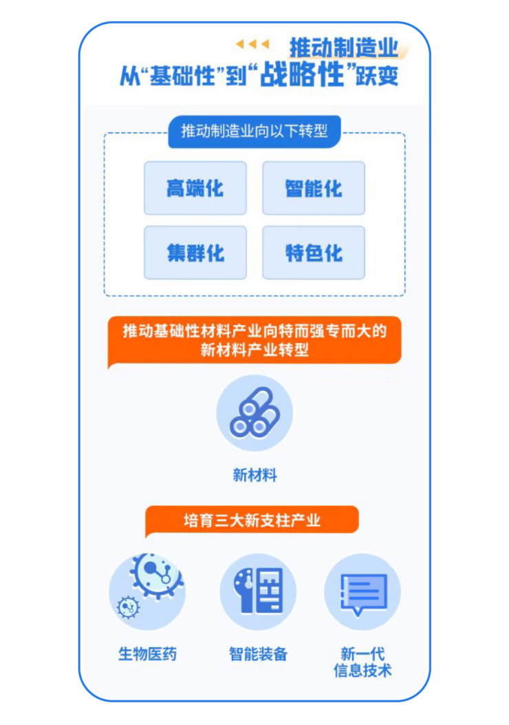 制造业向高端化、智能化、集群化、特色化转型,推动基础性材料产业向特而强、专而大的新材料产业转型,培育生物医药、智能装备、新一代信息技术三大新支柱产业。
