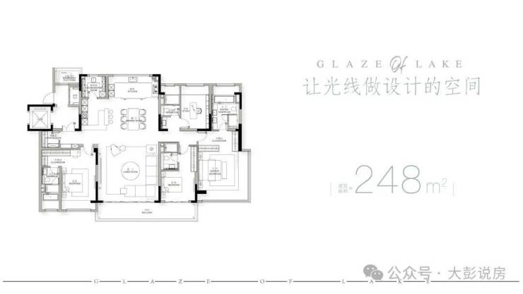 248㎡(4 房 2 厅 4 卫):五开间朝南,约 10 米巨幕阳台,湖景尽收