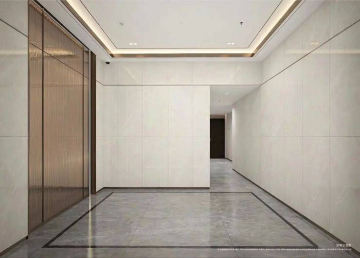 地下大堂落客区同样以星空顶点缀,轻盈墙面,打破常规砖墙的实体感;地面同玄关采用亮面工艺,融入品牌元素,增加归家仪式感。